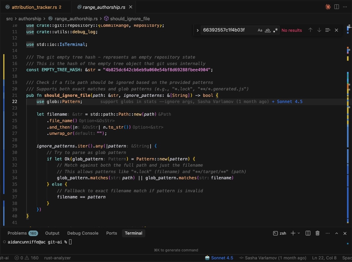 In VSCode (and all forks of VS Code) you can see AI-blame decorations in the gutter, making it easy to spot AI-authored lines generated by different agent sessions (color coded). The extension also tells you which model generated the code and (if session storage is enabled) the prompts that generated the code.